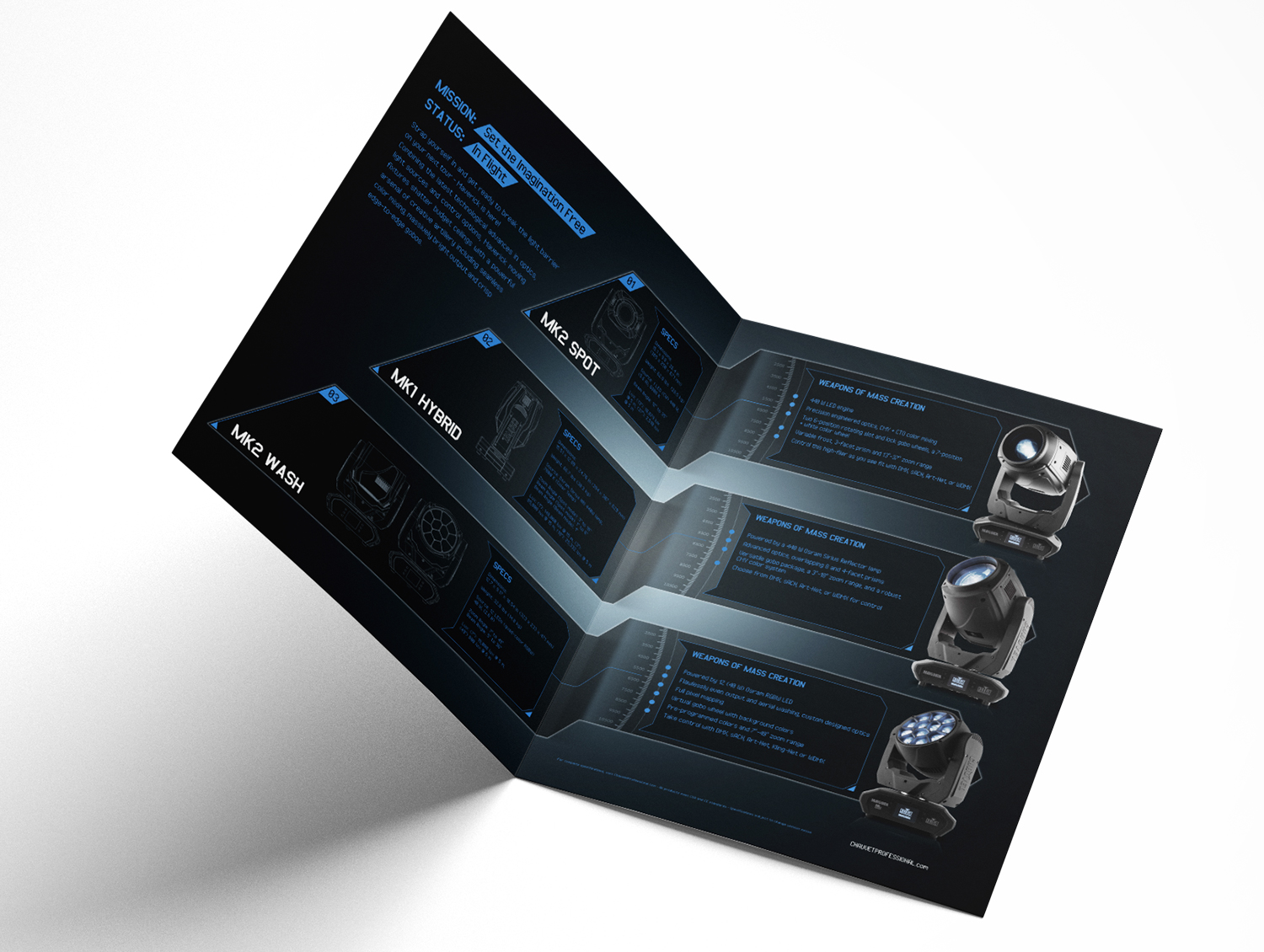 Chauvet Professional introduced three new moving heads to their customers as the new Maverick Series of lights. This is a sample of the product brochure and a cover ad.