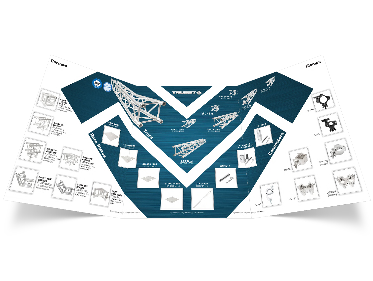 One key item for the new TRUSST® brand by Chauvet Lighting was its brochure of products. After developing the new logo, I created this three-fold brochure that holds all of their products. A distinctive blue brushed metal texture was combined with a creative layout using the shape of the logo symbol, this idea, resulted in the perfect opportunity to distribute all products evenly. The hard edges and the pointy corners give an elegant and professional look while keeping the original concept of high quality and durability.